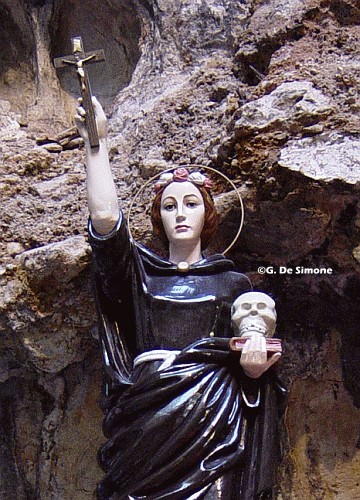 Rosalia nacque a Palermo nel XII secolo dalla famiglia Sinibaldi, nobili della corte reale normanna e feudatari nella Madonie dei monti della Quisquinia e delle Rose. La tradizione orale racconta che Rosalia visse a Palermo alla corte della regina Margherita, moglie di Guglielmo I di Sicilia. Fin dalla sua giovinezza decide di consacrarsi a Gesù Crocifisso scegliendo la penitenza eremitica e si ritirò seguendo l'esempio degli antichi anacoreti sul monte Pellegrino, avuto in dono dalla regina. Nell’ottobre del 1623 Palermo è infestata dalla peste; una donna moribonda, dopo aver ricevuto i sacramenti, durante la notte, sogna una giovane fanciulla che la invita a recarsi in pellegrinaggio alla grotta ove morì la santa. La mattina successiva la donna si sveglia completamente guarita. Il 26 maggio del 1624 si reca insieme ad altre alla grotta. Dopo aver pregato nella chiesetta dei frati, la donna si assopisce e ritorna la visione della fanciulla che le indica il punto dove Rosalia fu sepolta. Il 15 luglio 1624 quando vengono riportati alla luce i resti vergine eremita e vengono consegnati al cardinale Doria, Arcivescovo di Palermo, il quale nomina una commissione per esaminare i resti. Lo stesso anno durante i lavori di costruzione del convento domenicano di santo Stefano di Quisquina, sempre sul monte Pellegrino, fu scoperta in un'iscrizione latina riportante il testo: "Io Rosalia Sinibaldi, figlia delle rose del Signore, per amore del mio signore Gesù Cristo ho deciso di abitare in questo antro di Quisquina". Nel frattempo la peste dilagava per Palermo e dintorni. E' il 16 febbraio del 1625 quando la santa appare in visione ad un cacciatore, un certo Bonelli, e lo invita ad andare dalle autorità ecclesiastiche e riferire che la peste sarebbe cessata solamente portando le sue reliquie in processione attraverso la città. Il cardinale Doria, sollecitato dalla popolazione, autorizzò la processione al termine della quale la città si ritrova miracolosamente liberata dalla peste, grazie all’intercessione della "santuzza", come i palermitani chiamano affettuosamente santa Rosalia. Nel frattempo, conclusi gli atti del processo di ritrovamento e attestata l’autenticità dei resti e delle numerose grazie ricevute per sua intercessione, il cardinale Doria invia gli atti a papa Urbano VIII, il quale, dopo il regolare processo, ne sancisce la veridicità facendo inserire nel martirologio il ricordo della santa, il 4 settembre e il 15 luglio, giorno di ritrovamento delle reliquie. A Palermo la santa è festeggiata dal 10 al 15 di luglio in tutta la città con innumerevoli momenti che mettono in evidenza la liberazione della città dalla peste, la festa si conclude con la solenne processione per la vie della città della preziosissima urna argentea contenente le reliquie della amata "santuzza". |