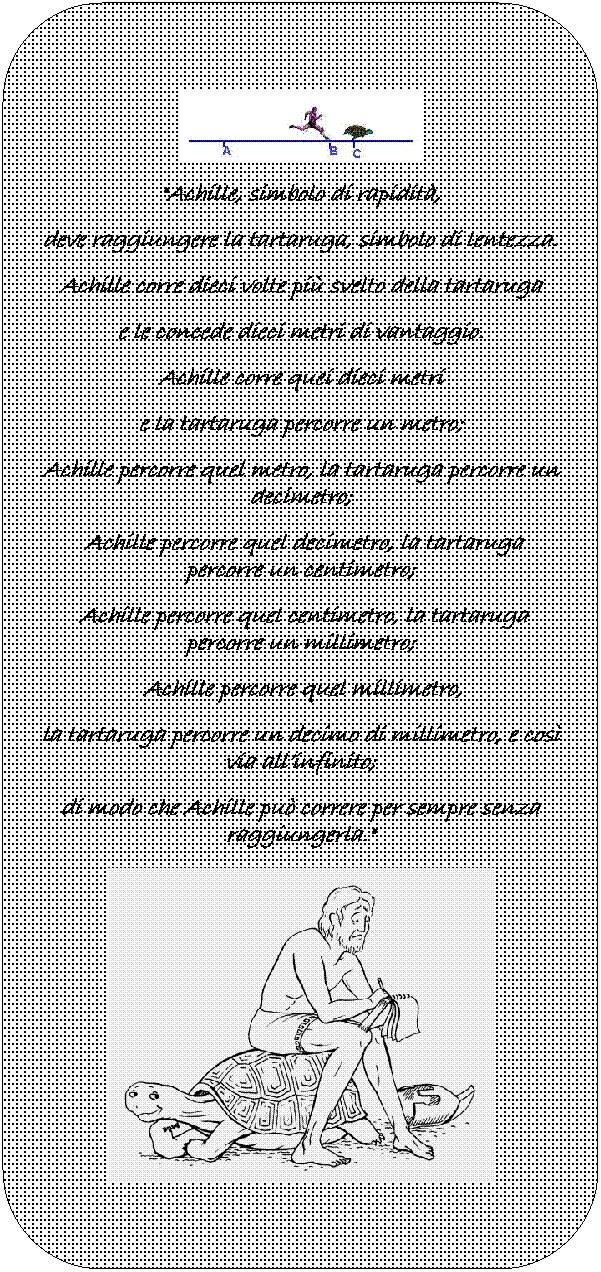 Secondo Aristotele, La tartaruga sarà raggiunta non appena si conceda che il percorso è una linea finita. _____∞_____ Torna su |